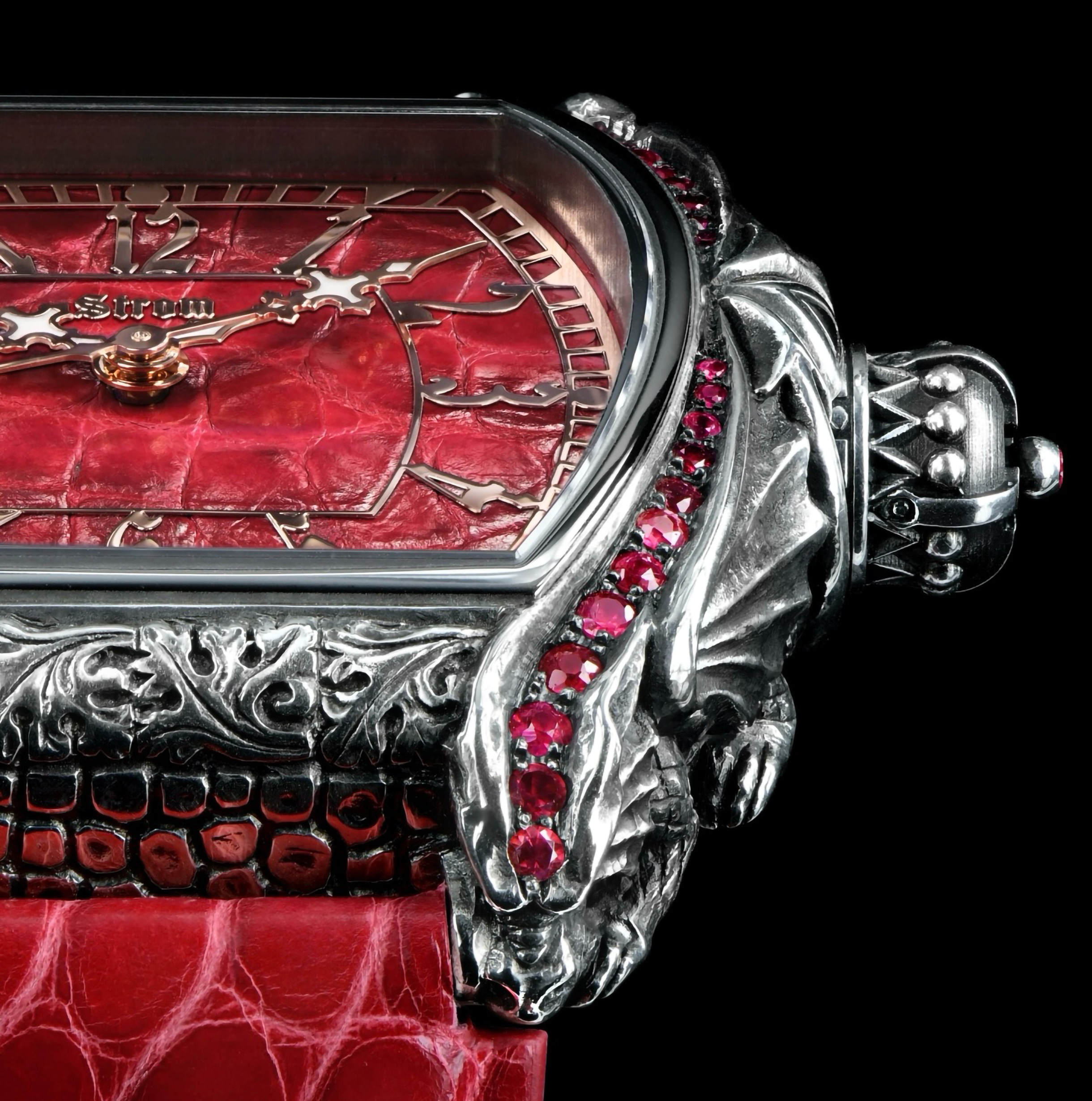 Hand made in red alligator leather and red gold plated hour markers