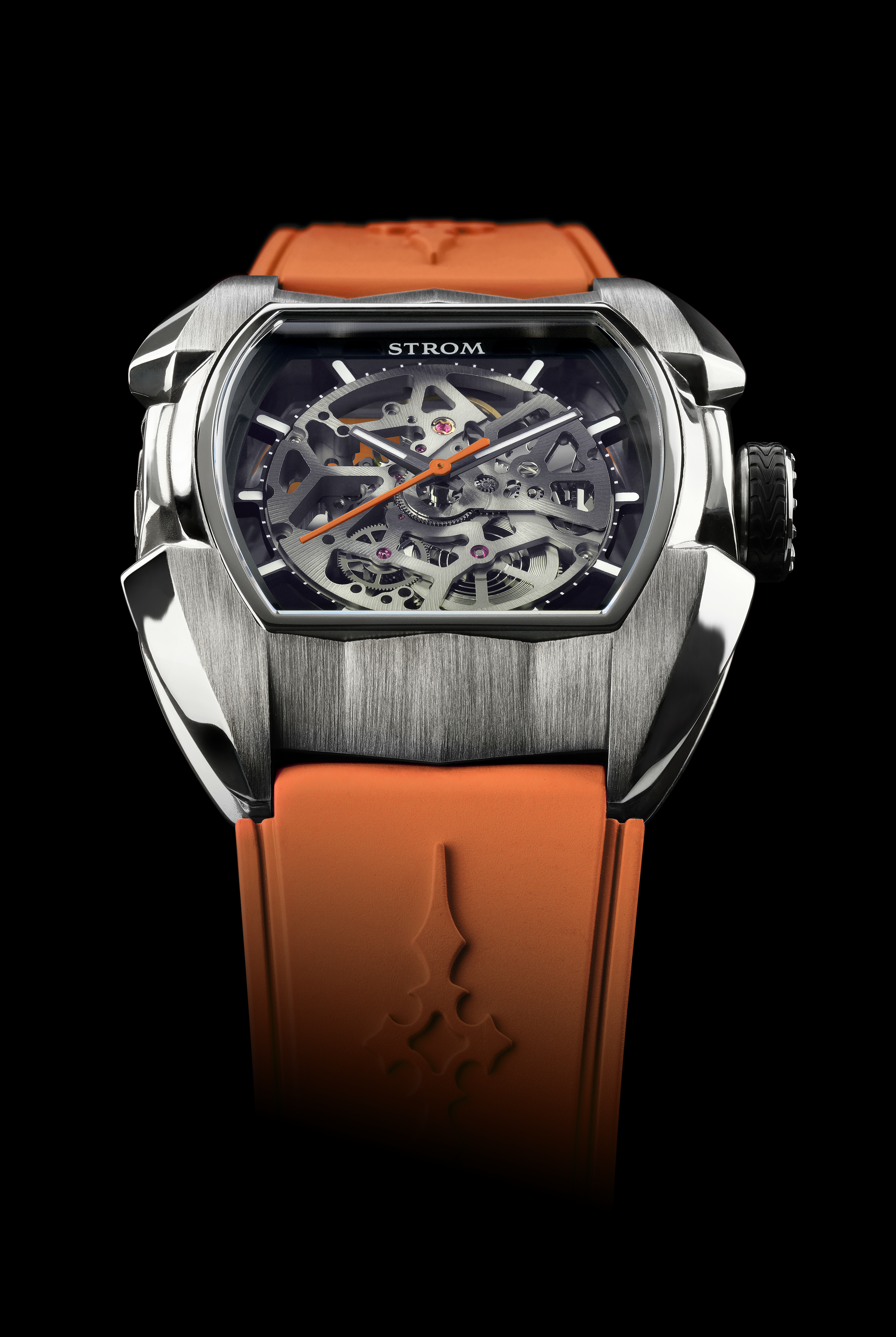 The case and clasp of the Ventus III incorporate various design elements from contemporary sports cars. The case features a sapphire crystal with anti-reflective coatings on both sides, providing a clear view of the “engine”, the skeletonized automatic movement in ruthenium grey. The movement-retaining ring is also skeletonized and doubles as the dial. The second hand is available in orange, red, blue, turquoise, or white to match the rubber strap.