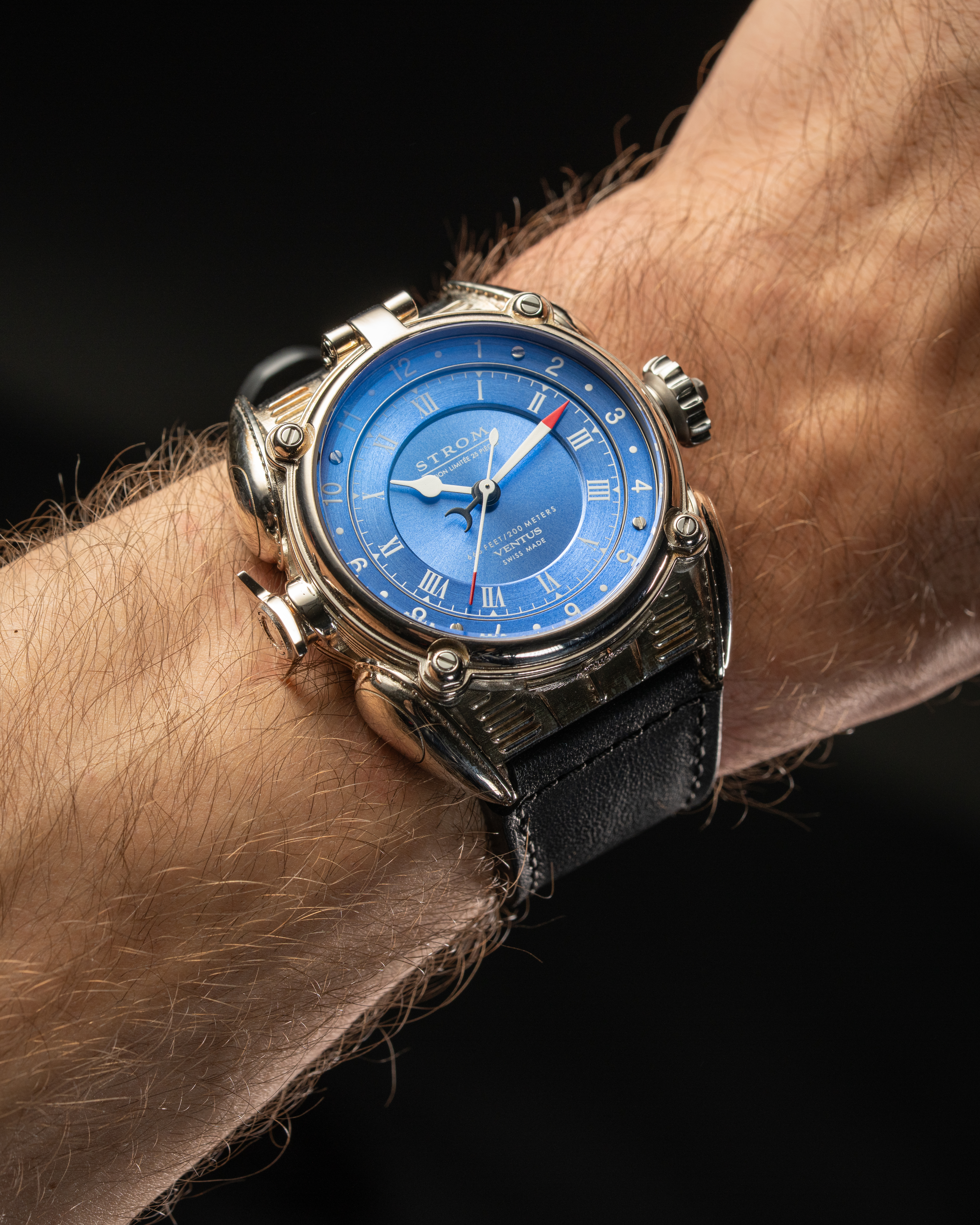 Width: 45,5mm without, 57mm incl. crowns Height: 55mm incl. lugs Thickness: 17,5mm The case is slightly domed to fit the wrist